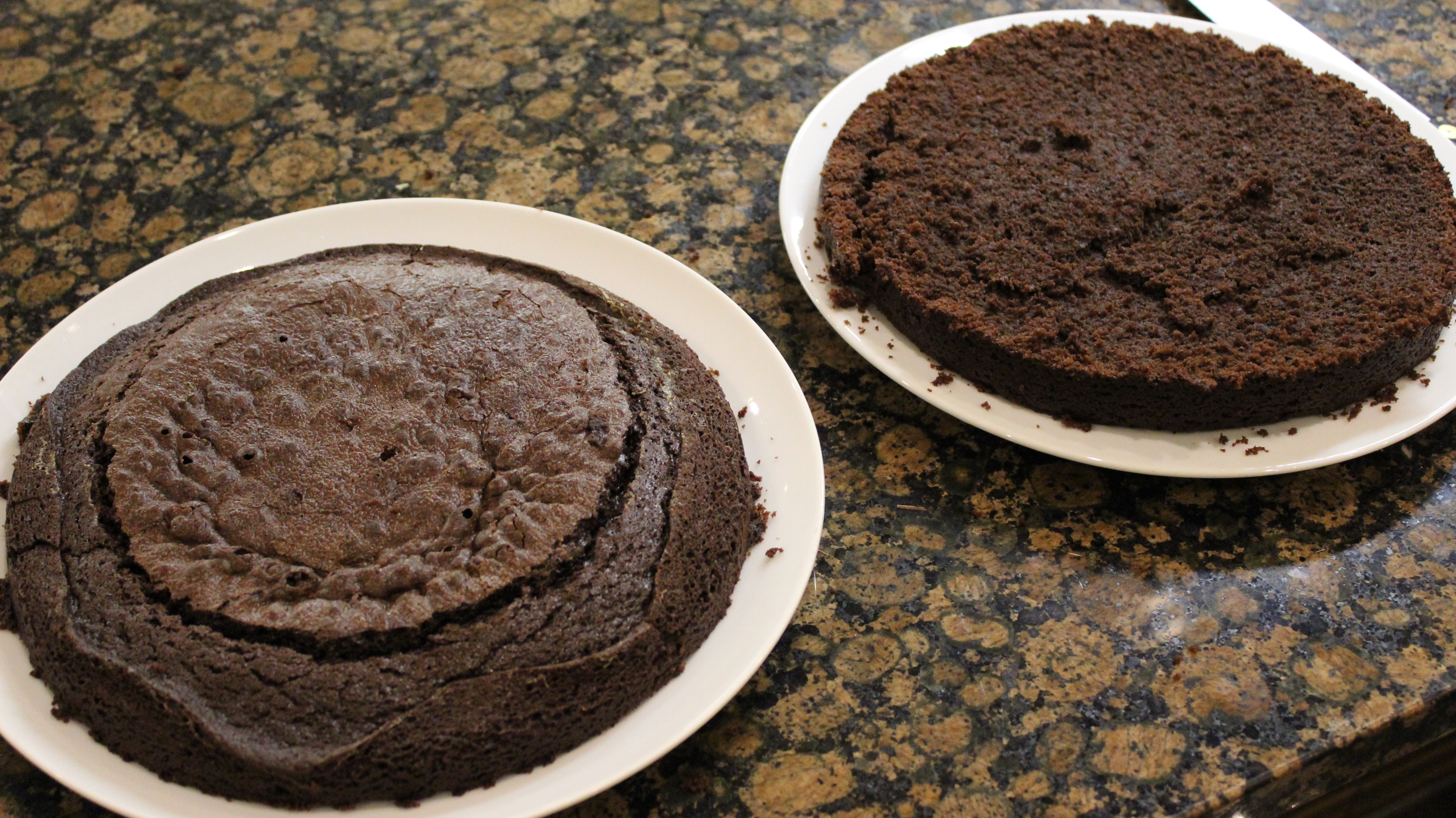 4. When the cake is cold, cut it horizontally into three (In my case I cut into two but it’s entirely up to you). Make the ganache: chop 200g good quality dark chocolate into small pieces and tip into a bowl. Pour a 284ml carton of double cream into a pan, add 2 tbsp golden caster sugar, and heat until it is about to boil. Take off the heat and pour it over the chocolate. Stir until the chocolate has melted and the mixture is smooth.
