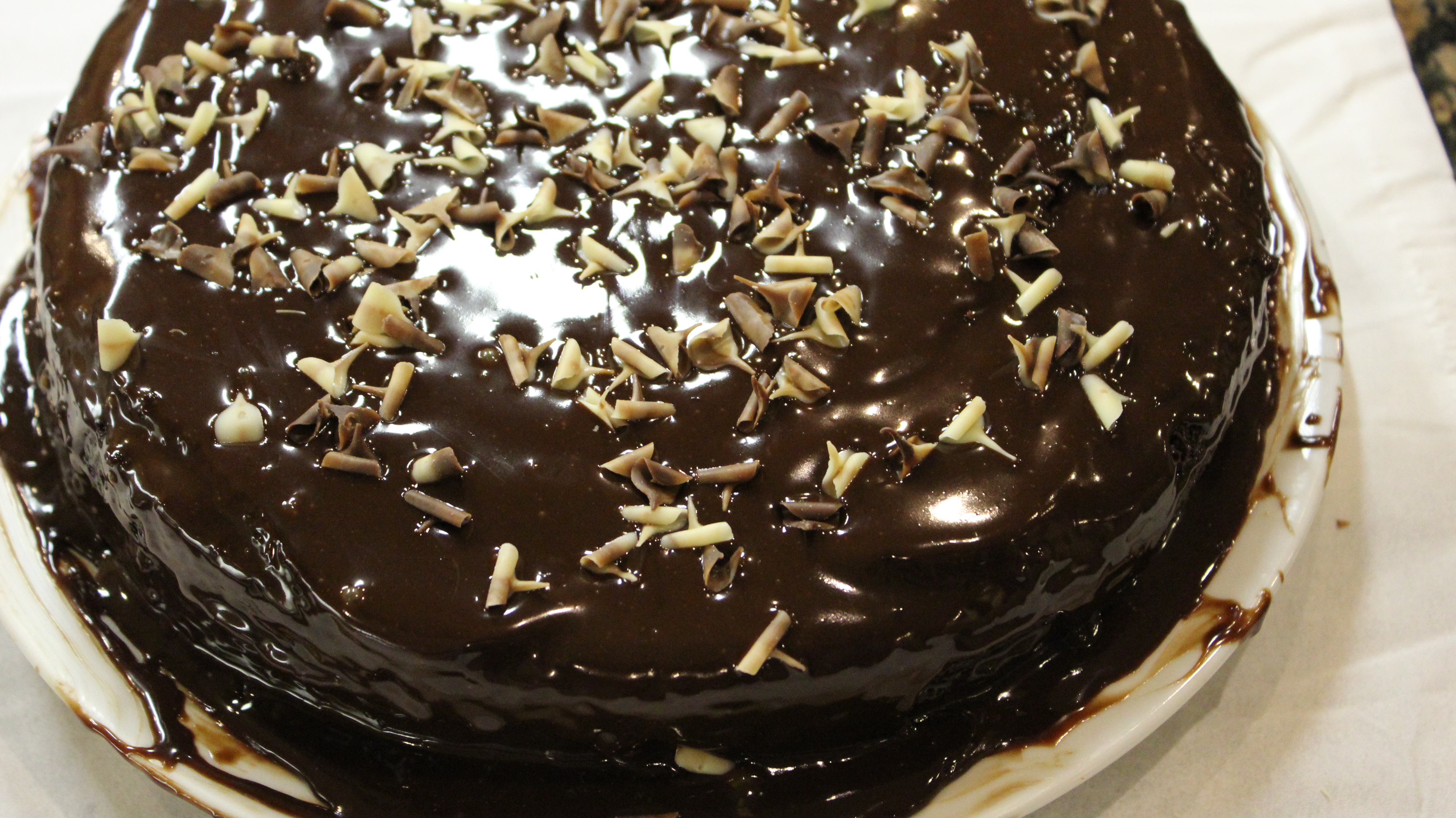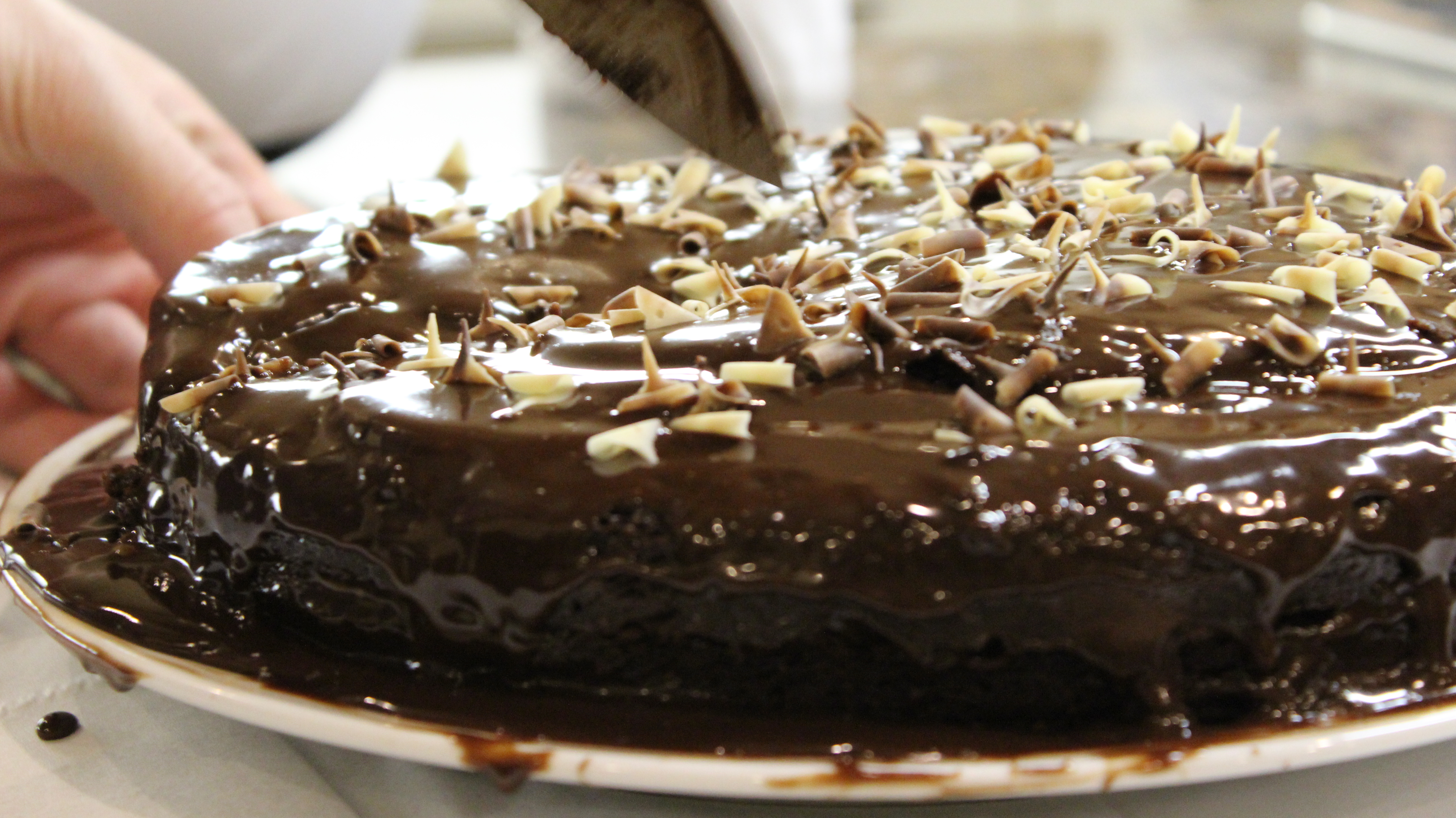 5. Sandwich the layers together with just a little of the ganache. Pour the rest over the cake letting it fall down the sides and smoothing to cover with a palette knife. Decorate with grated chocolate or a pile of chocolate curls. The cake keeps moist and gooey for 3-4 days.