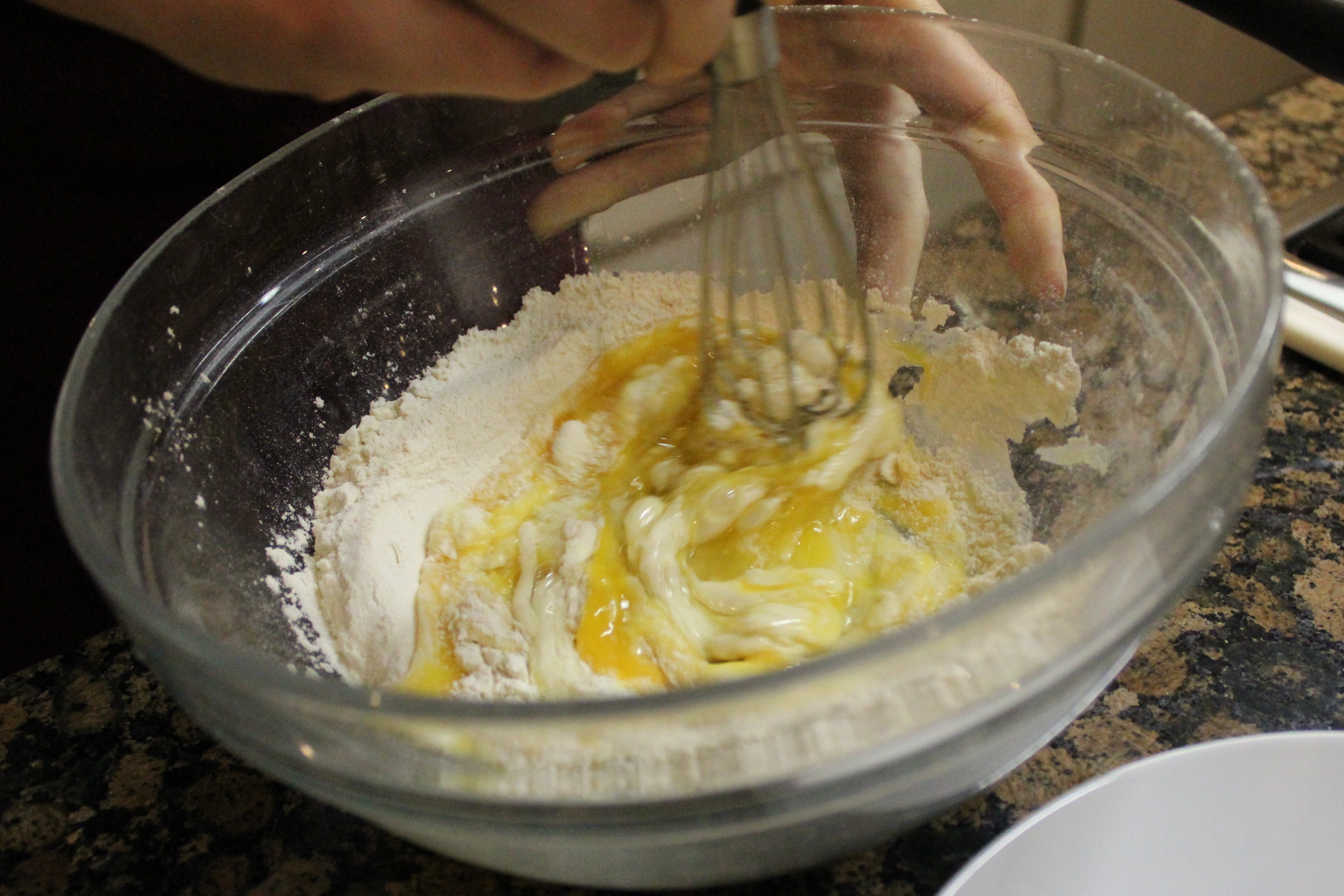 - Sift the flour and salt into a large mixing bowl with a sieve held high above the bowl so the flour gets an airing. Now make a well in the centre of the flour and break the eggs into it. Then begin whisking the eggs – any sort of whisk or even a fork will do – incorporating any bits of flour from around the edge of the bowl as you do so.