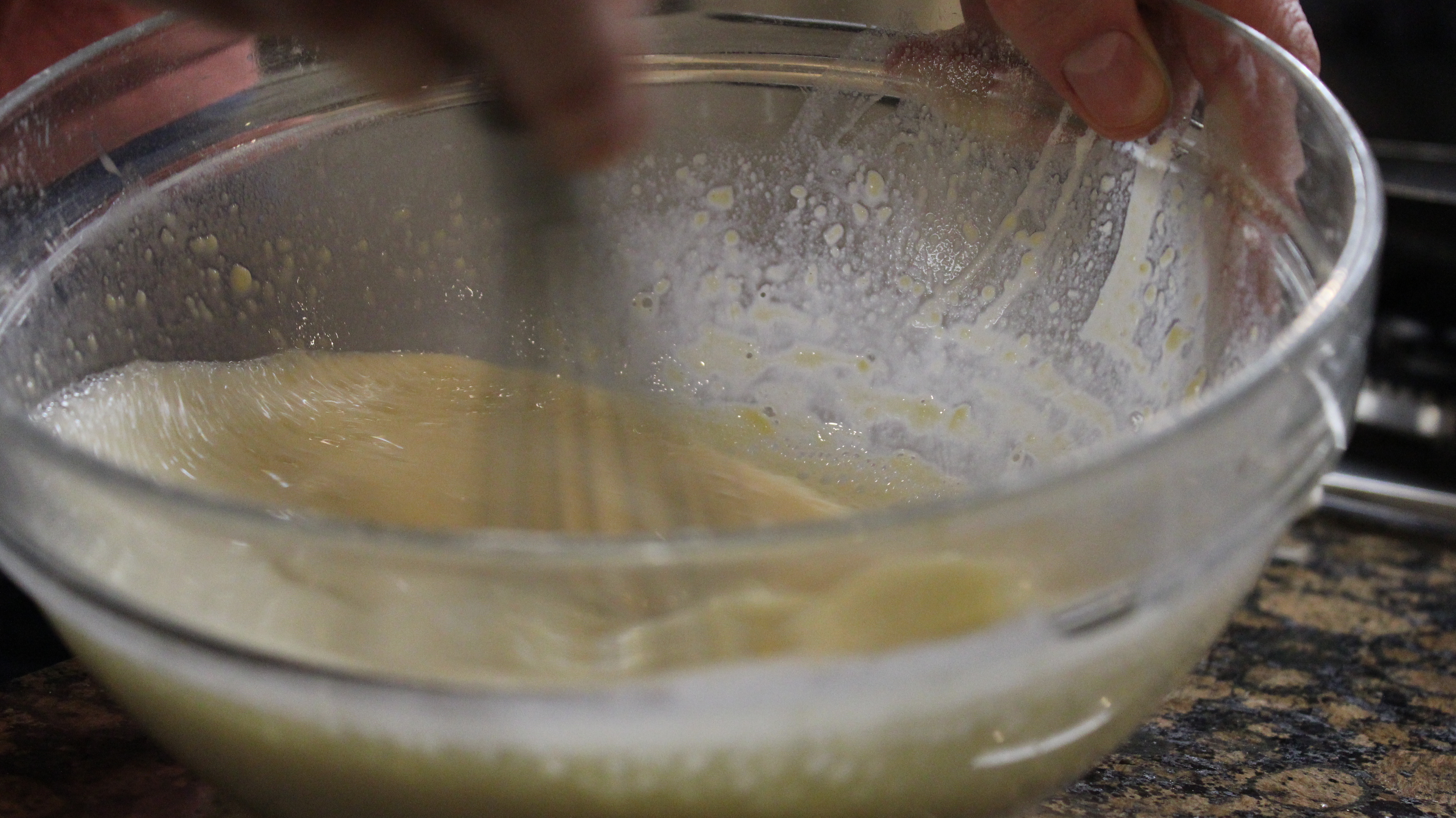 - 2. Next gradually add small quantities of the milk and water mixture, still whisking (don’t worry about any lumps as they will eventually disappear as you whisk). When all the liquid has been added, use a rubber spatula to scrape any bits of flour from around the edge into the centre, then whisk once more until the batter is smooth, with the consistency of thin cream.