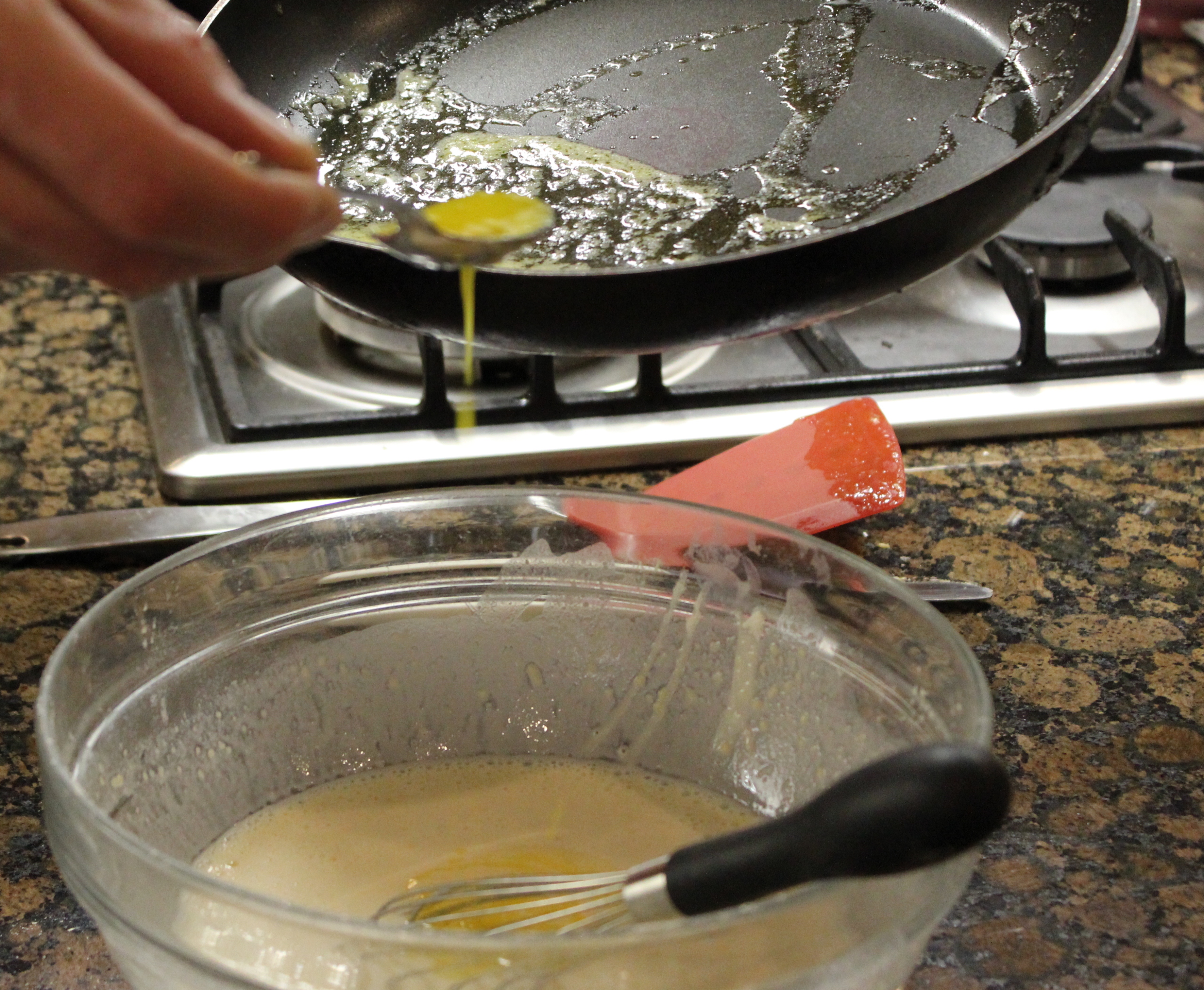 3. Now melt the 50g/2oz of butter in a pan. Spoon 2 tbsp of it into the batter and whisk it in, then pour the rest into a bowl and use it to lubricate the pan, using a wodge of kitchen paper to smear it round before you make each pancake. (This is probably where we went wrong as got too excited, we missed this part out!)