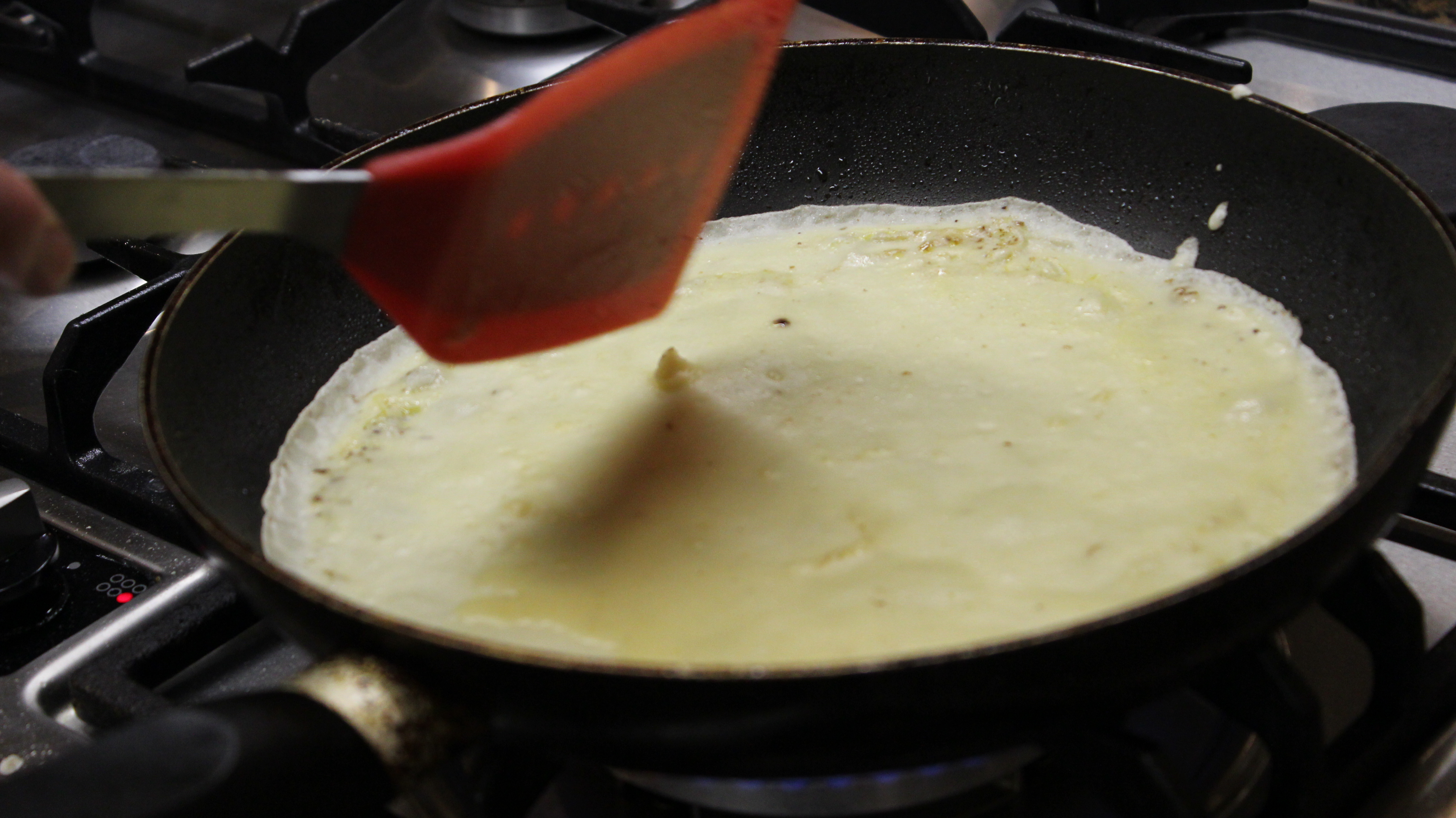 4. Now get the pan really hot, then turn the heat down to medium and, to start with, do a test pancake to see if you’re using the correct amount of batter. I find 2 tbsp is about right for an 18cm/7in pan. (2tsp was a bit too little for me but you can see how you get on) It’s also helpful if you spoon the batter into a ladle so it can be poured into the hot pan in one go. As soon as the batter hits the hot pan, tip it around from side to side to get the base evenly coated with batter. It should take only half a minute or so to cook; you can lift the edge with a palette knife to see if it’s tinged gold as it should be. Flip the pancake over with a pan slice or palette knife – the other side will need a few seconds only – then simply slide it out of the pan onto a plate.