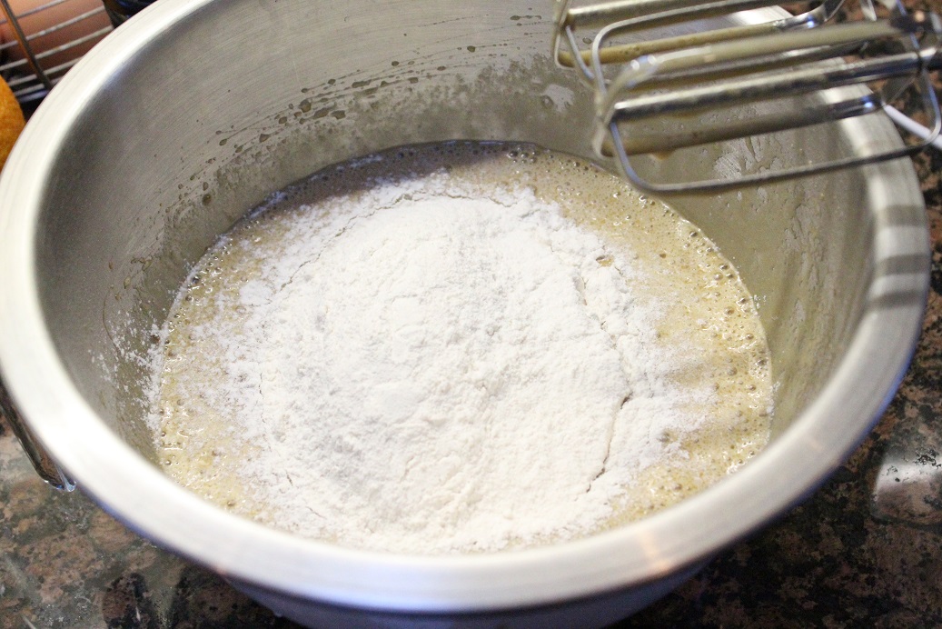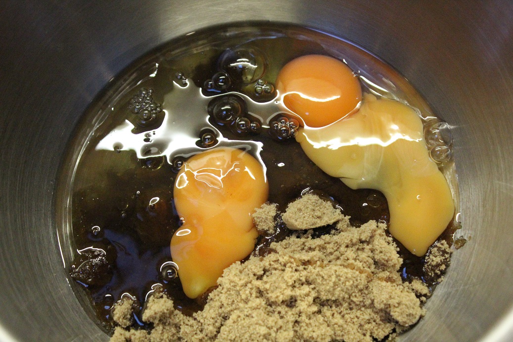 1) Put the oil, eggs and sugar in a mixing bowl and whisk together until smooth.