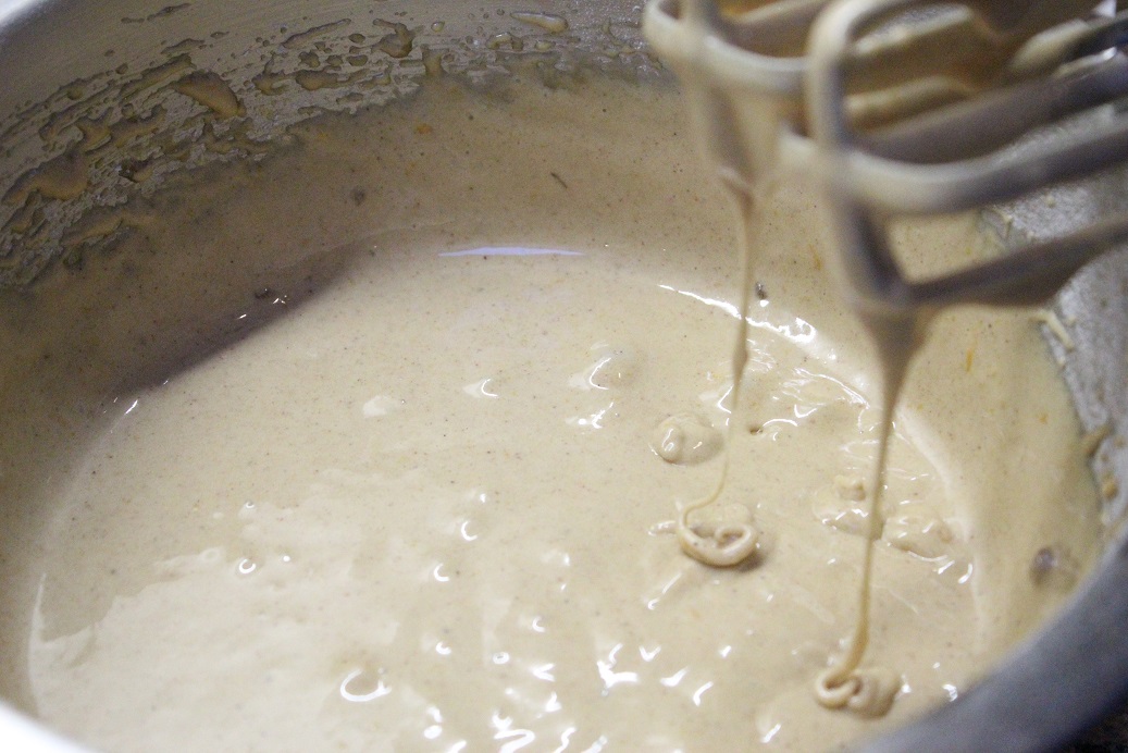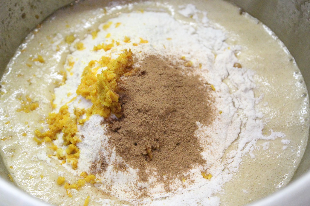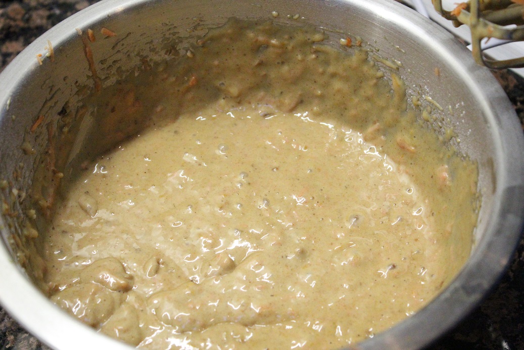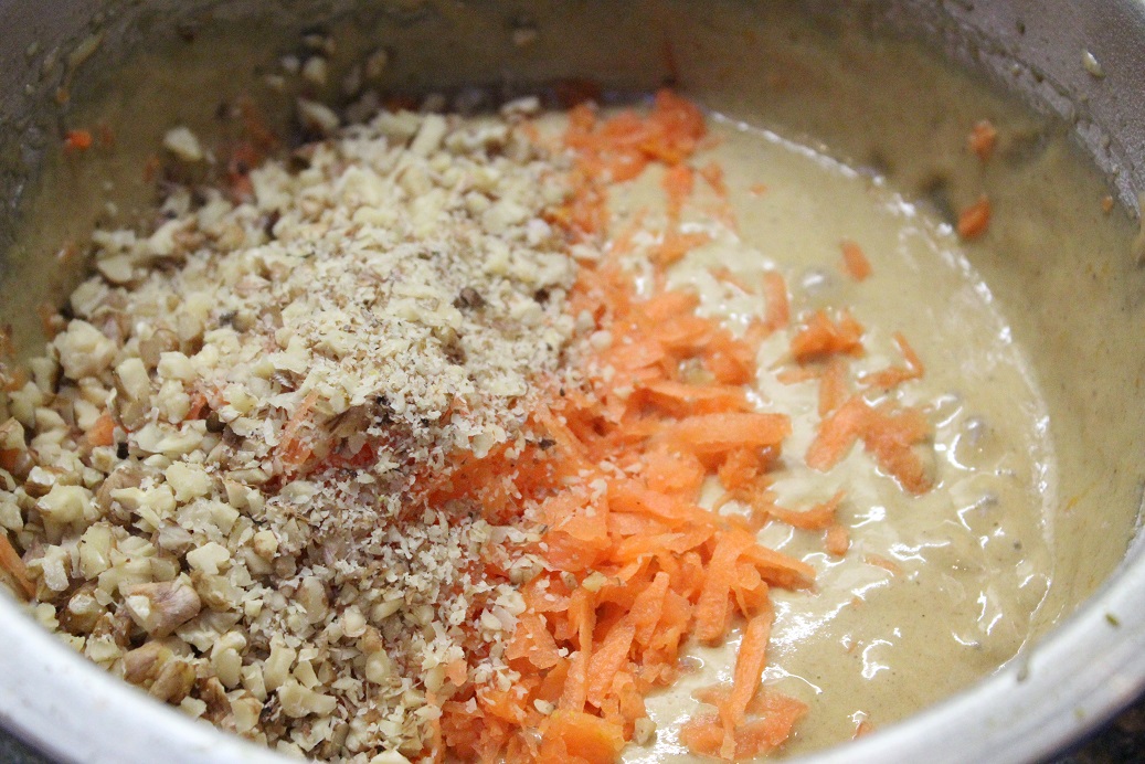 2) Add the flour, baking powder, orange rind and ground cinnamon and whisk again until smooth. Stir in the grated carrots and chopped nuts.