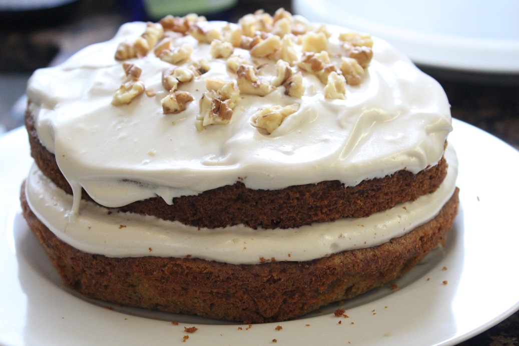 6) Cut each cake in half then sandwich the layers together with frosting. Transfer to a serving plate, then swirl the rest of the frosting over the top and sides of the cake. Decorate the top with walnut pieces.