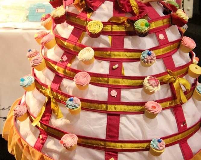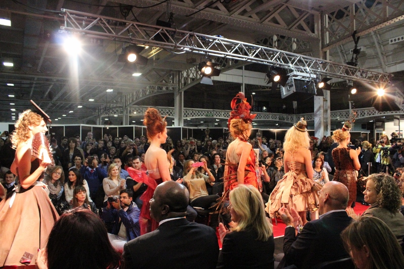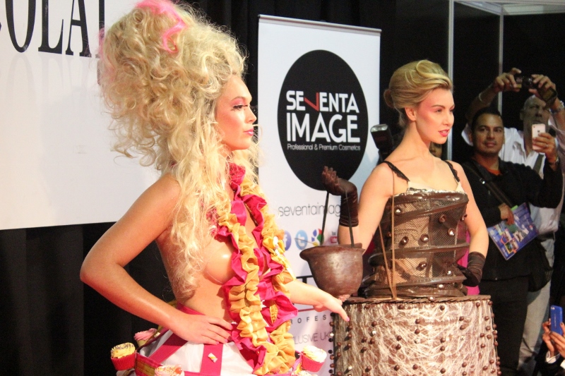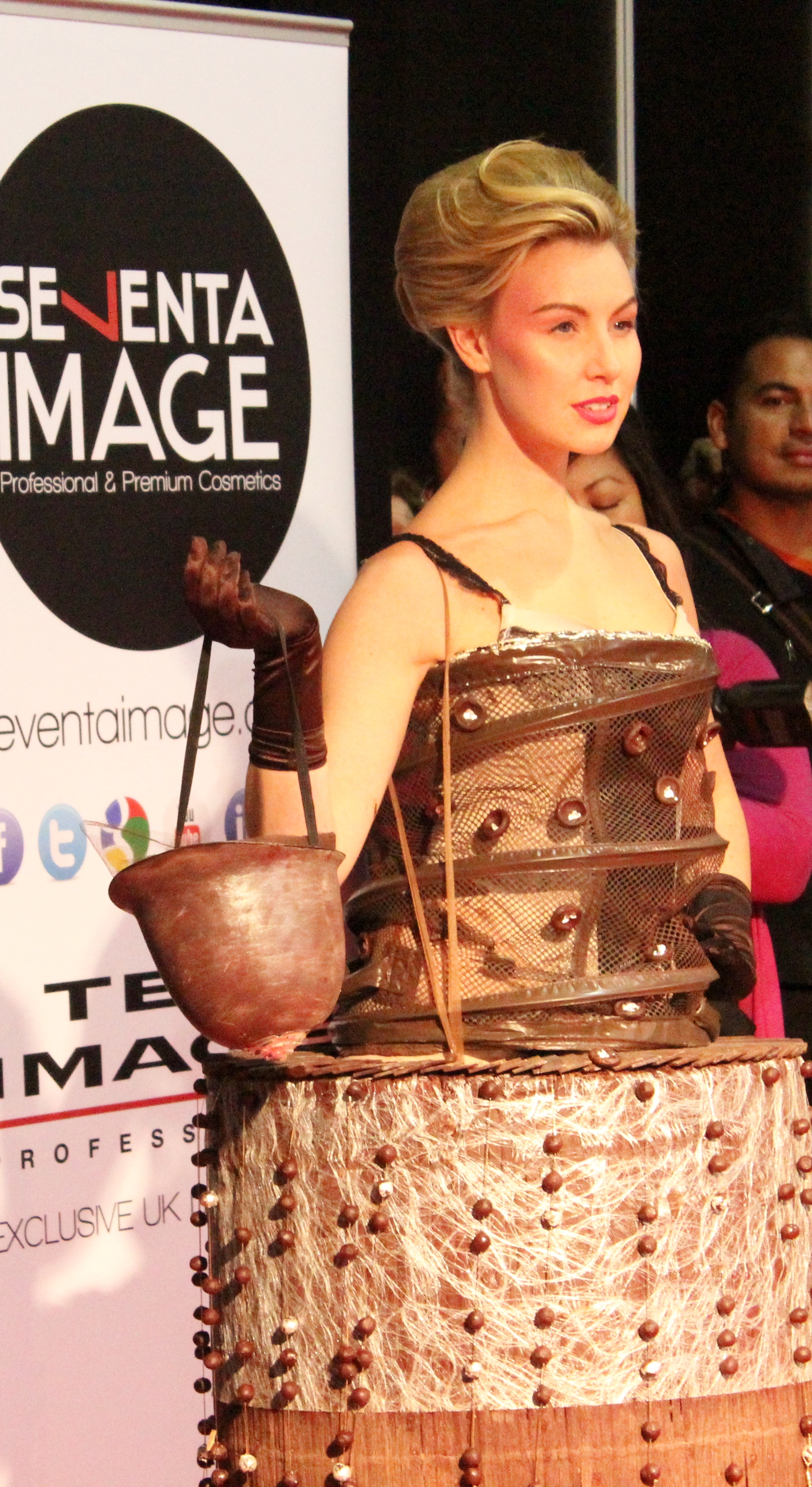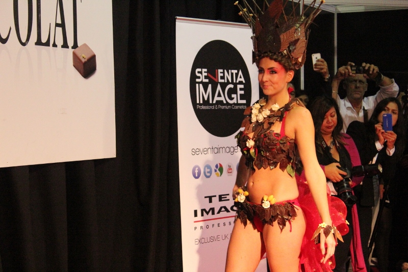 Before we knew, it was time for the fashion show to begin and it really was spectacular. Stunning models took it in turn to walk down the red carpet dressed in couture outfits made and inspired by chocolate. The outfits were designed by the country’s top chocolatiers and top fashion designers including Mark Tiling of Squires Kitchen and London Patisserie On Café. The stand out ones were a steampunk dress from bridal wear designer Hannah Wilkins-Webb and award-winning Shropshire-based chocolatier Julia Wenlock (owner of Toot Sweets) as well as a beautiful cupcake dress by French chocolatier and pâtisssier Madame Trignon. The model carried herself amazingly well and offered cupcakes to the crowd which caused a round of applause.