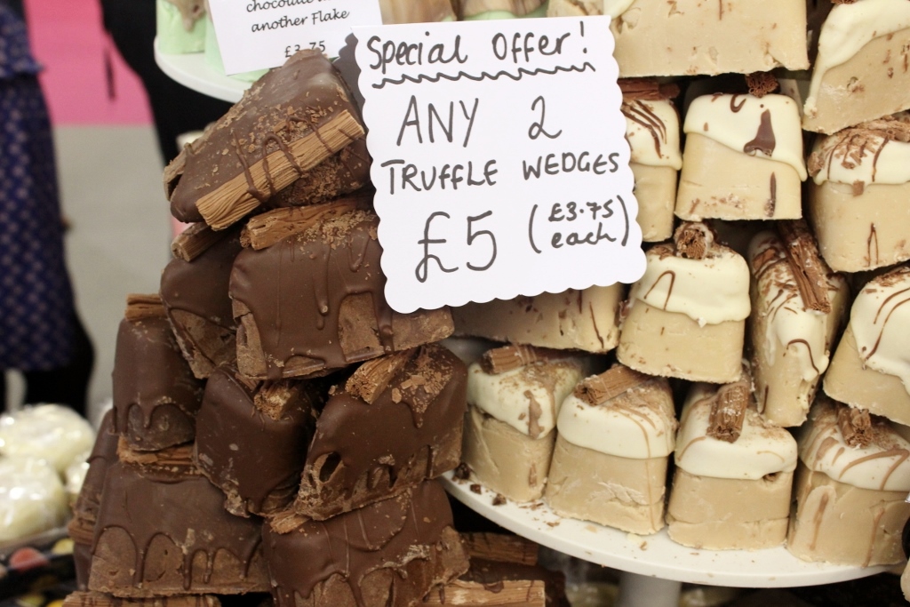 I walked backwards and forwards past this stand as I desperately wanted to try the truffle slabs but didn’t know whether to in the case I didn’t like them. There were a lot of fudge bars and Guinness glasses made out of fudge for sale too but I’m not a big lover of fudge. My eyes were drawn to the shape of the truffles and the description of what was inside them, double cream, cadburys milk chocolate, on top of more chocolate- how could I not like them! After passing, without buying, five times, I decided to take the plunge and bought both the kinder bueno and death by chocolate ones. I was so excited and unfortunately I was a tad disappointed with the result. Although the chocolate was creamy I didn’t feel that the flavour was strong enough to either love or dislike, rather it just fell in between. I’m sure I will eat them both at some point, or share them for that matter considering the size, but in this case I felt they looked better than they tasted.