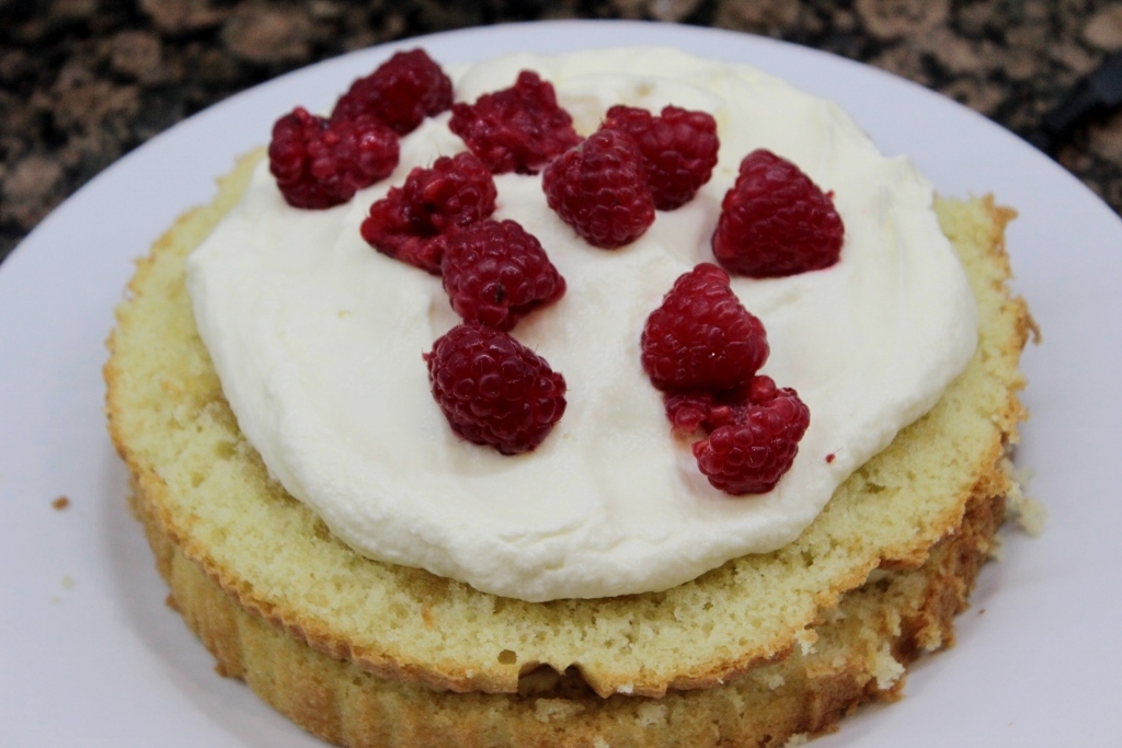 6. Spread with cream and fruit as before and top with another half of cake and more cream and berries.