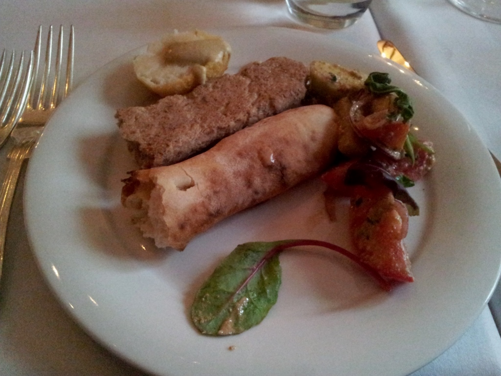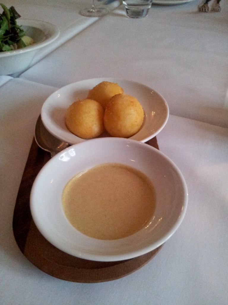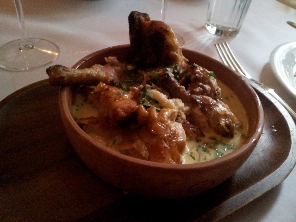 Last Thursday night was my first blogger’s meet up with Zomato and it was held at the beautiful hand decorated Georgian restaurant, Marani, based in Mayfair. On arrival I was given a tour of the restaurant and informed about the Georgian artist who came over from Georgia to paint and curate the restaurant in the space of 6 months. The restaurant was decorated with beautiful paintings, chandeliers made from wine glass bottles and intricate crafted candle sticks and was simply stunning yet extremely homely at the same time. The staff were extremely attentive and polite and guided me to our table upstairs which was beautifully presented and allowed me the opportunity to sit down and meet with other bloggers. It wasn’t long before food was brought out which consisted of, Elarji & Bazhe (polenta & cheese balls with an almond dipping sauce), Chkmeruli (corn-fed grilled baby chicken in a garlic & cream sauce) as well as Georgian breadsticks and a delicious light and zesty cucumber and tomato salad.