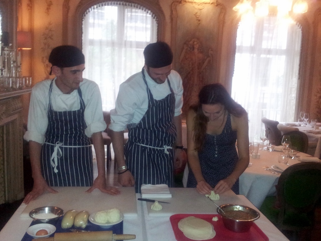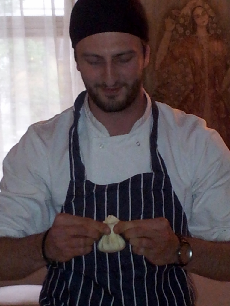After meeting and greeting each other we sampled each of the dishes whilst learning stories about Georgian food and their culture. Our wine glasses were continuously topped us whilst we ate and before we were finished we were brought into the room next door to learn how to make dumplings. Two of the chefs gave a thorough and in-depth presentation of how they are made and afterwards asked if we would like to make one too. Never one to shy away from anything food related I speedily volunteered to make a dumpling and it turned out to be a lot of fun. The base of the dumplings is made using 1kg flour, 1 egg and 300ml water, such simple ingredients. This gives the pastry like base and then once you make it you roll it out, place the meat in the middle then wrap the meat in the base and fold the top bit into layers overlapping each other until one end meets the other. You then need to cut off the top and you have your dumpling!