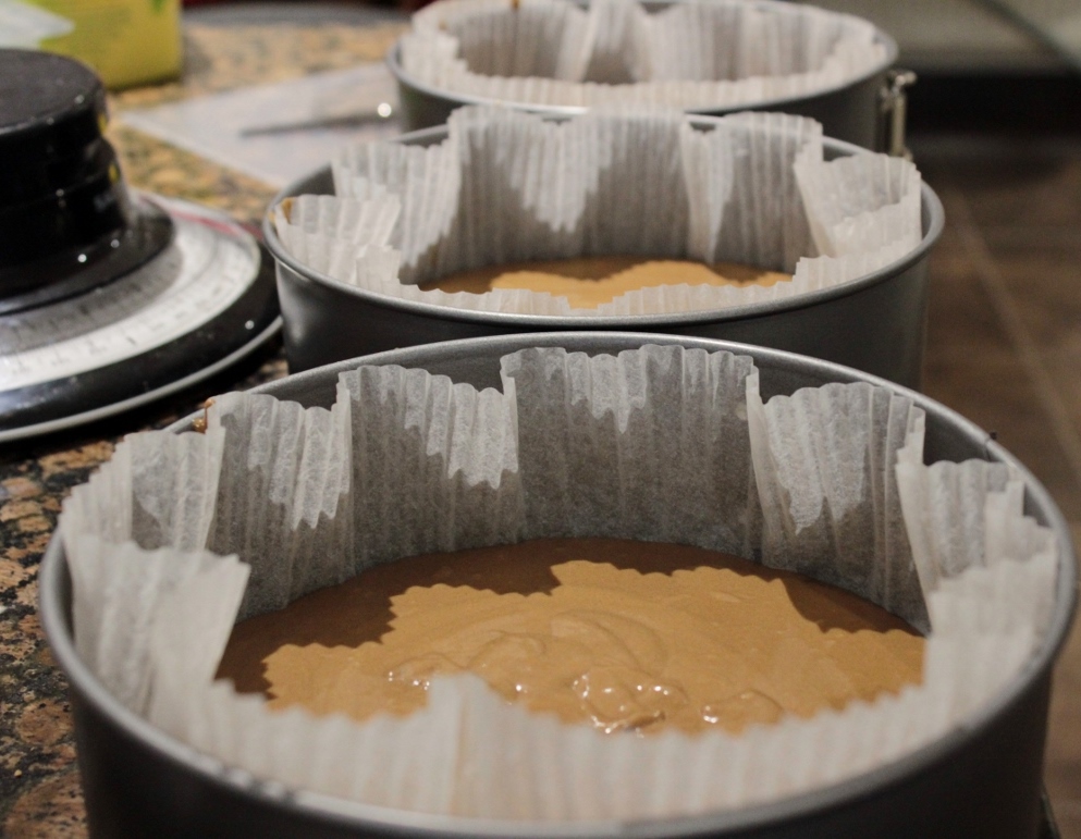 9) Divide the batter evenly amongst the three prepared tins. Bake for approximately 20-25 minutes or until the sponge bounces back when lightly touched. Remove from the tins and allow to cool completely before frosting.