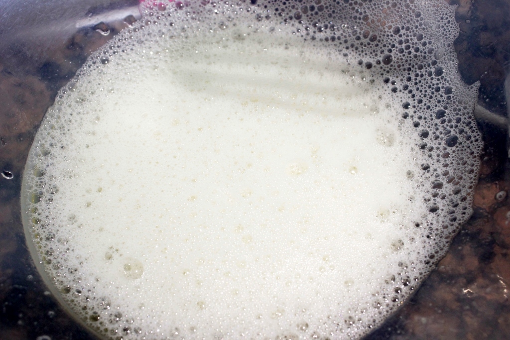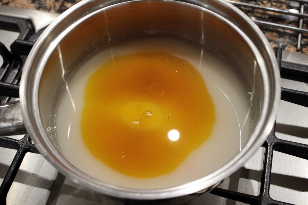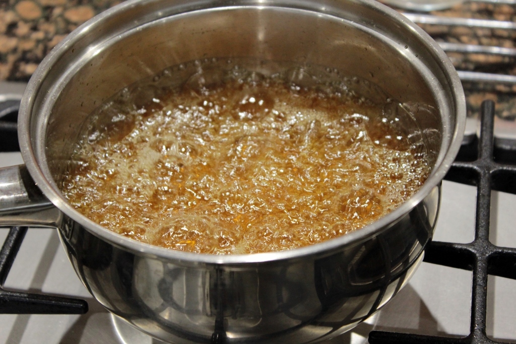 10) In a medium saucepan, dissolve the sugar and golden syrup in the water. Bring this to the boil. This must boil, without stirring, until the sugar reaches the soft ball stage (a little bit of the syrup dropped into cold water will form a soft ball). If you have one, use a sugar thermometer to check when it’s ready – it needs to reach 115ºC, 239ºF.