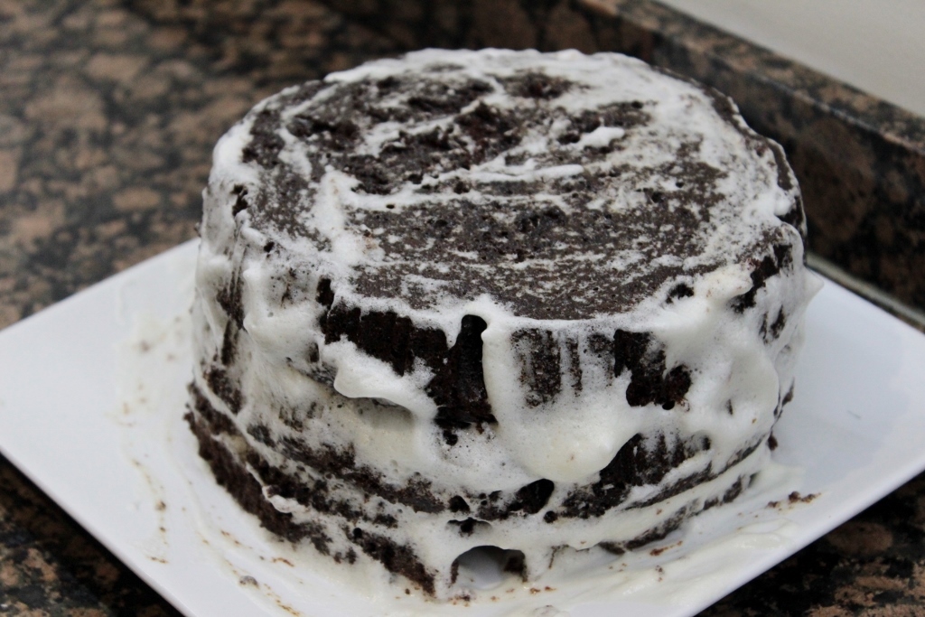 The cake I decided to bake, literally two days before and ended up baking at 9pm Sunday night was from my new Hummngbird bakery cookbook, Home Sweet Home, which I was given as a birthday present (thank you Sibel). There are so many mouth watering recipes in this new book that not only includes cupcakes, but swiss rolls, cheesecake and pies. The cake I picked is the Chocolate cake with Vanilla Meringue frosting and I chose it due to its cool arty topping and simply for how delicious it looked in the picture. I also wanted more of a challenge (although at 9p.m it probably wasn’t the best idea!)