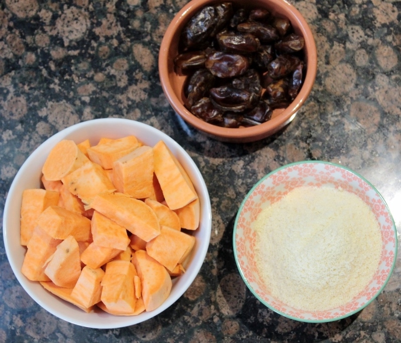 3) Put the remaining ingredients into a bowl, before mixing in the sweet potato date combination. Stir well.